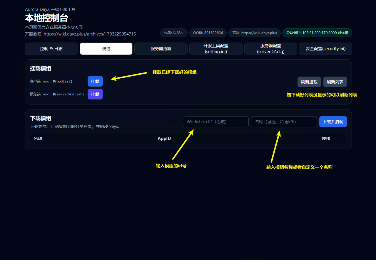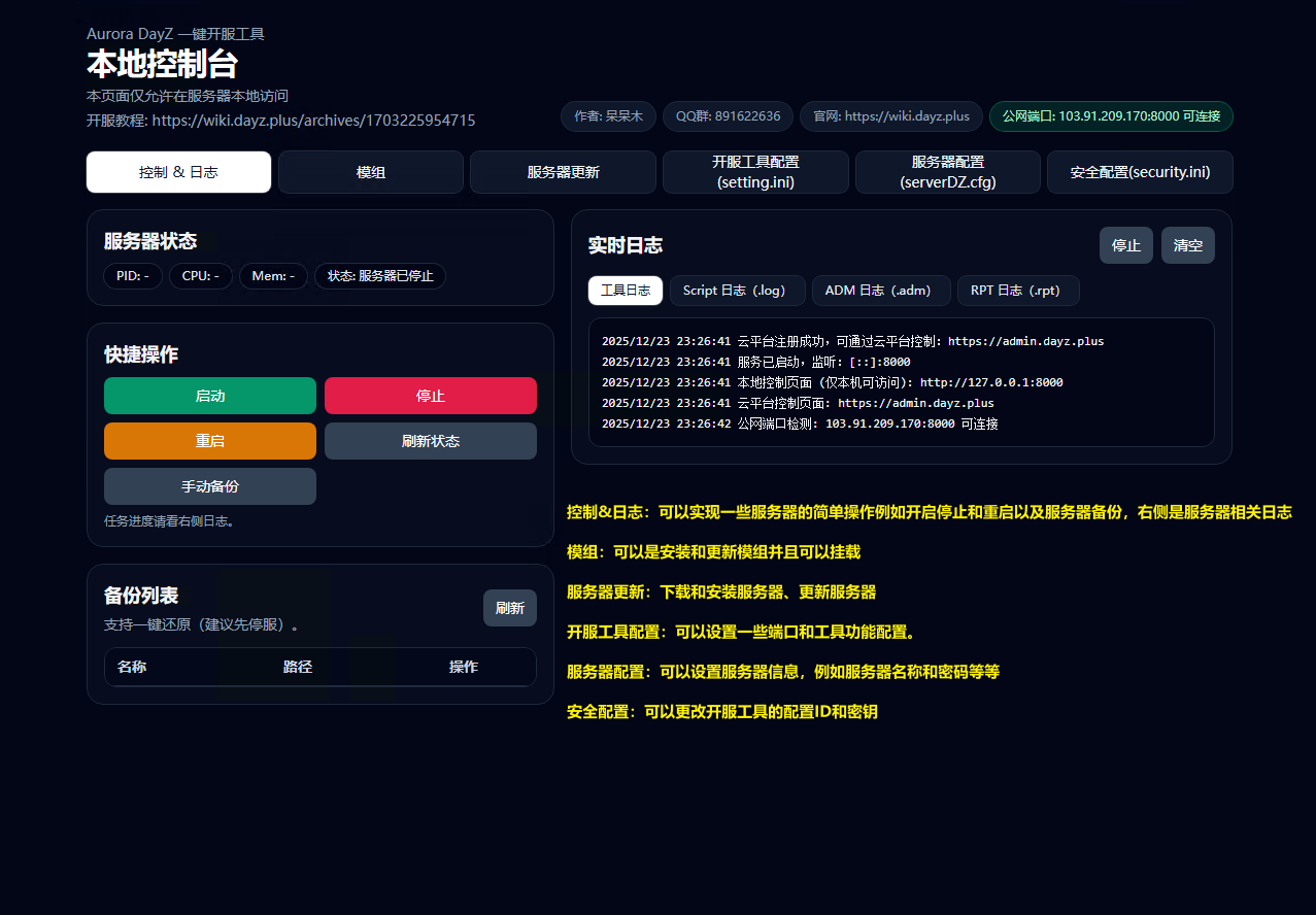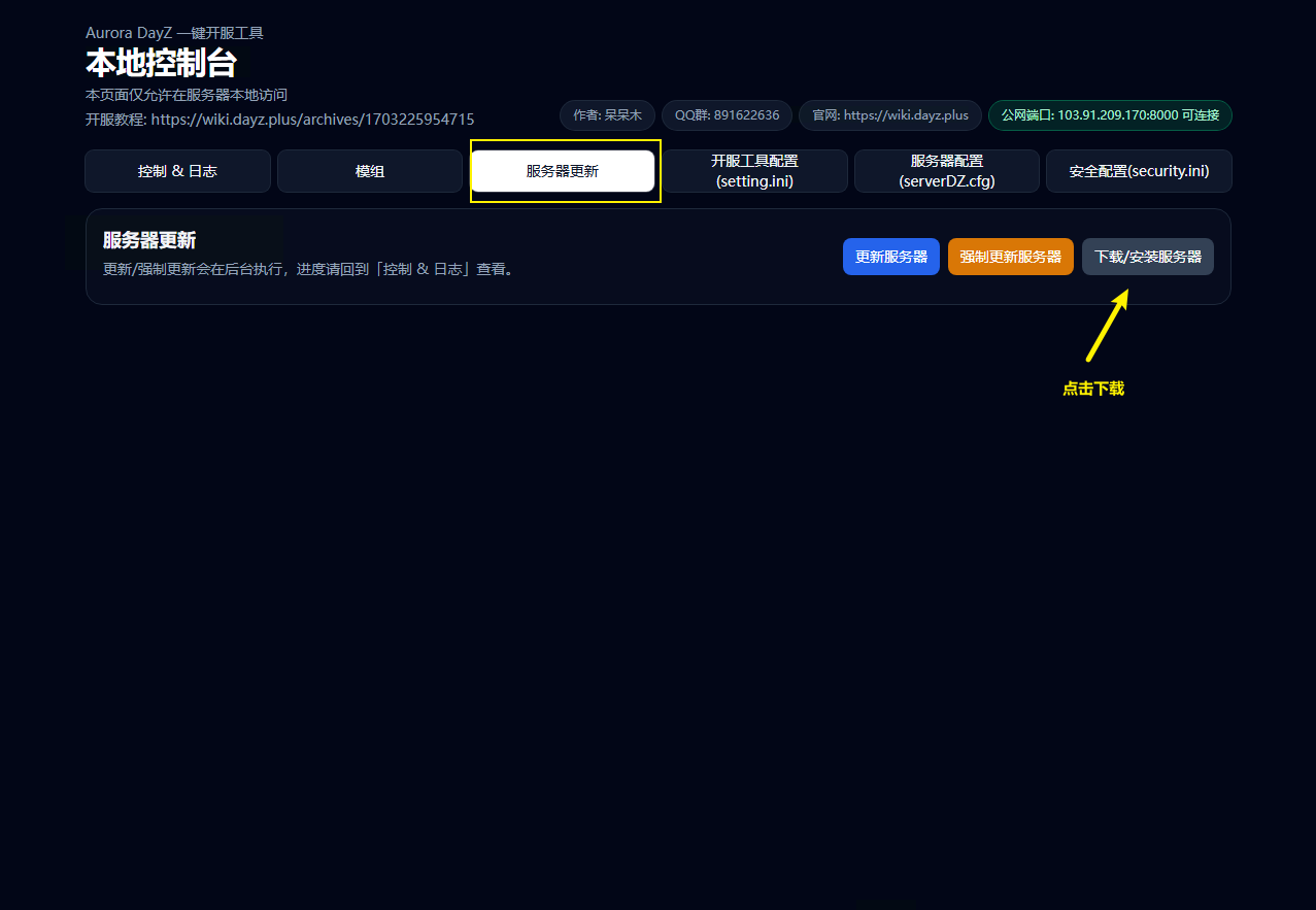 设置和控制服务器的基本功能,例如服务器的开启和关闭、模组的下载安装和更新、服务器的下载安装更新