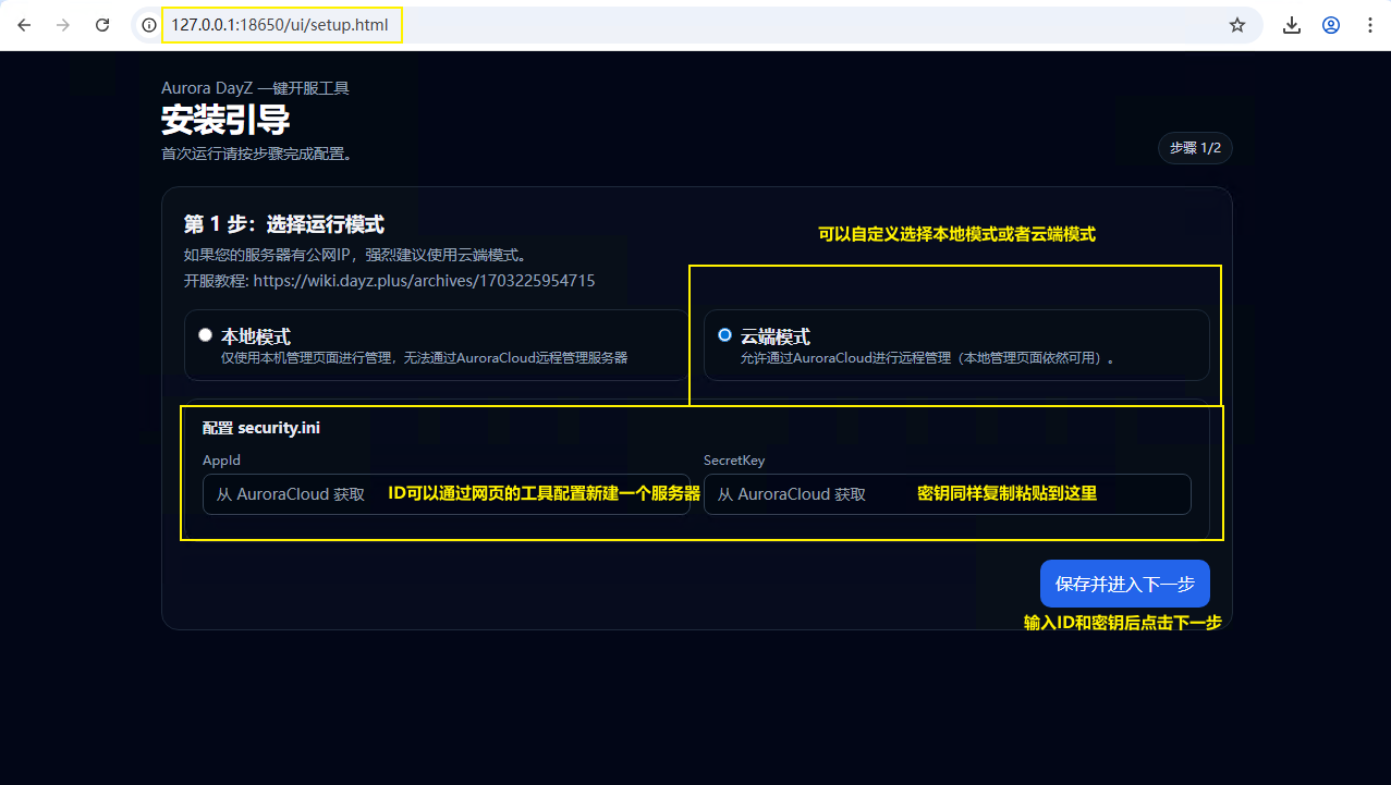 在本地控制台界面可以选择“本地搭建”和“云端搭建”具体可以根据个人喜好选择,我这里就用云端搭建作为演示。ID和密钥在工具配置完成后会自动生成,具体可看“1.设置工具配置”